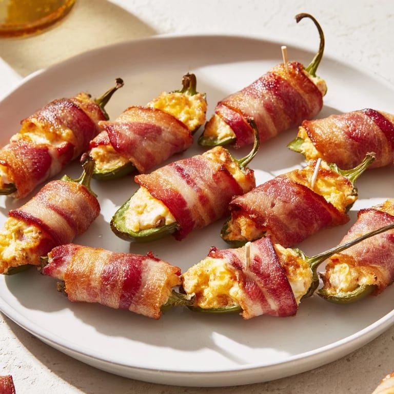 Save A festive, spicy appetizer featuring jalapeños stuffed with creamy cheese, wrapped in crispy bacon perfect for holiday gatherings.