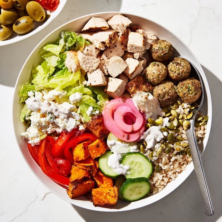Options include grilled chicken, marinated tofu, cooked shrimp, and falafel. Add chickpeas or tempeh for plant-based choices.
