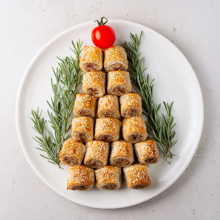 Save A festive, crowd-pleasing appetizer featuring golden, flaky mini sausage rolls arranged in the shape of a Christmas tree—perfect for holiday gatherings.