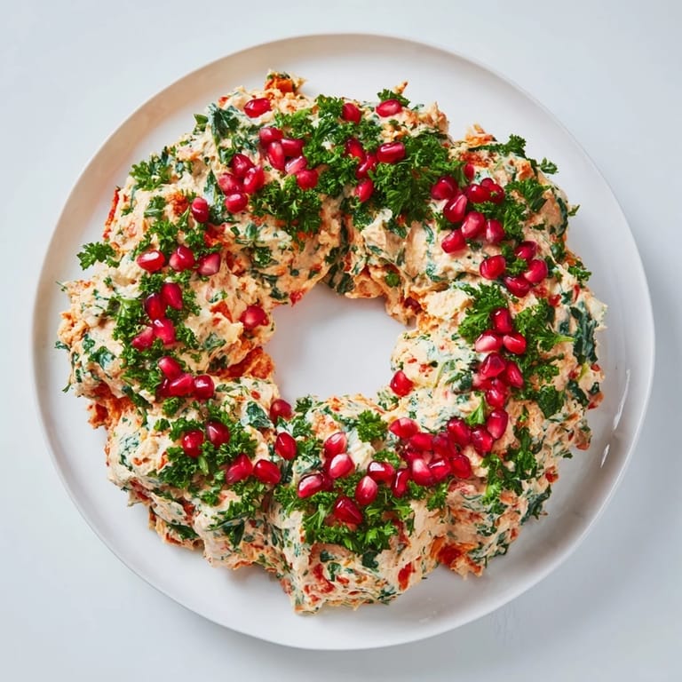- Garnish the top of the dip wreath with chopped parsley and pomegranate seeds to mimic festive holly.