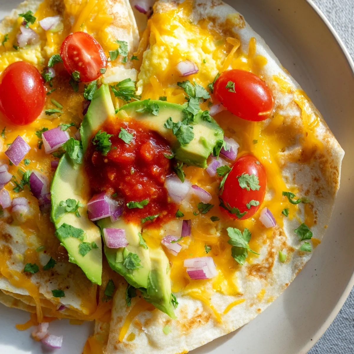 Fresh veggies like cherry tomatoes, bell peppers, and red onions complement the eggs and cheese, while avocado and salsa add creaminess and zest.