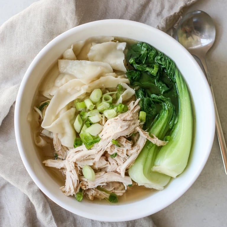 - Add the shredded chicken and chopped bok choy. Simmer for 2 minutes.