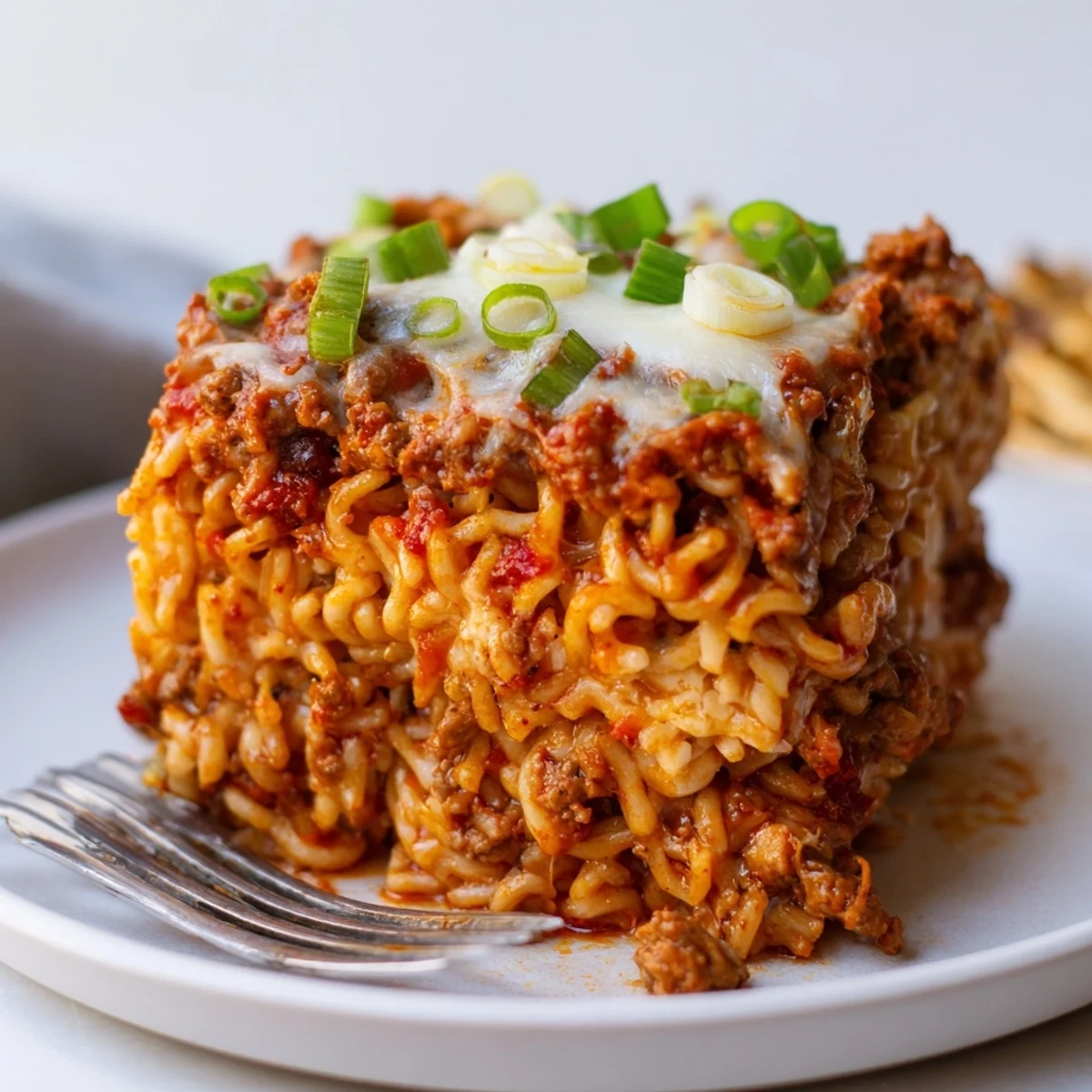 Save  A bold and inventive fusion dish that layers ramen noodles, spicy ground pork, tangy tomato sauce, and creamy cheese for a comforting, flavor-packed meal.