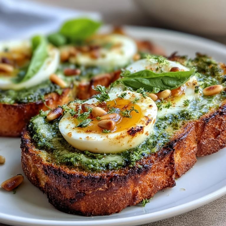Save What makes this recipe sing is the harmony of textures and flavors. The sourdough bread provides a tangy, hearty base with a satisfying crunch, while the spinach pesto — made smooth and spreadable by a drizzle of extra virgin olive oil — brings an earthy, herby freshness that is anything but ordinary. A small garlic clove adds gentle warmth, and the lemon juice lifts everything with a touch of brightness. Then comes the egg: soft-boiled for exactly 6 minutes, transferred to an ice bath to stop the cooking, and peeled to reveal that glorious jammy yolk. Finished with flaky sea salt, freshly ground black pepper, and optional chili flakes or microgreens, this dish is as stunning to look at as it is to eat.