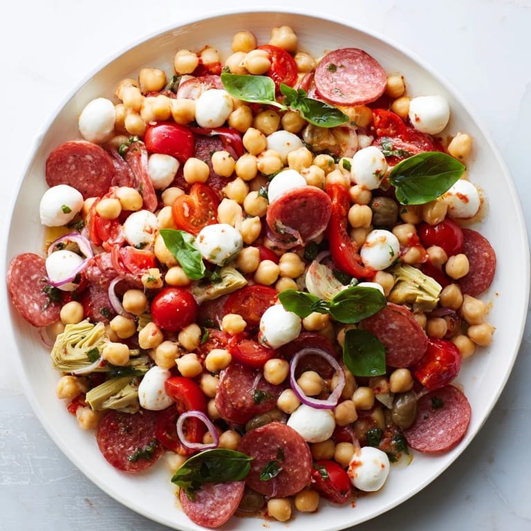 Save There's something about standing in the kitchen on a lazy afternoon, opening the pantry and finding a can of chickpeas staring back at you, when suddenly everything clicks into place. I had fresh mozzarella that needed using, some pepperoni from a charcuterie board still sitting in the fridge, and that jar of roasted red peppers that always seemed to find its way into my cart. I tossed them together almost out of curiosity, drizzled on a quick vinaigrette, and what emerged was this bright, satisfying salad that didn't taste like I'd just thrown things together—it tasted intentional, Italian, alive.
