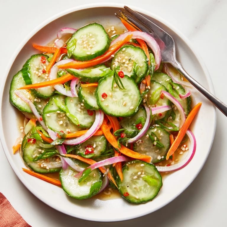 Save A refreshing, vibrant cucumber salad tossed with Asian-inspired seasonings, sesame oil, and fish sauce for a savory, tangy kick—perfect as a side or light appetizer.