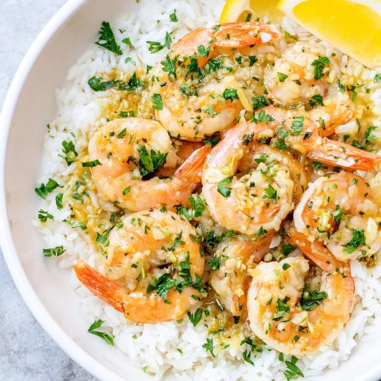 Save Succulent shrimp sautéed in garlic butter, served over fluffy rice with a touch of lemon and fresh herbs for a vibrant, satisfying meal.