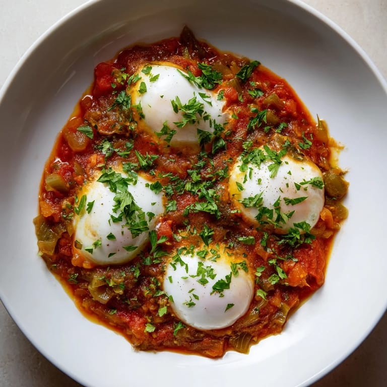 Save A vibrant, budget-friendly North African dish featuring poached eggs in a spiced tomato and pepper sauce. Perfect for breakfast, brunch, or a light dinner.