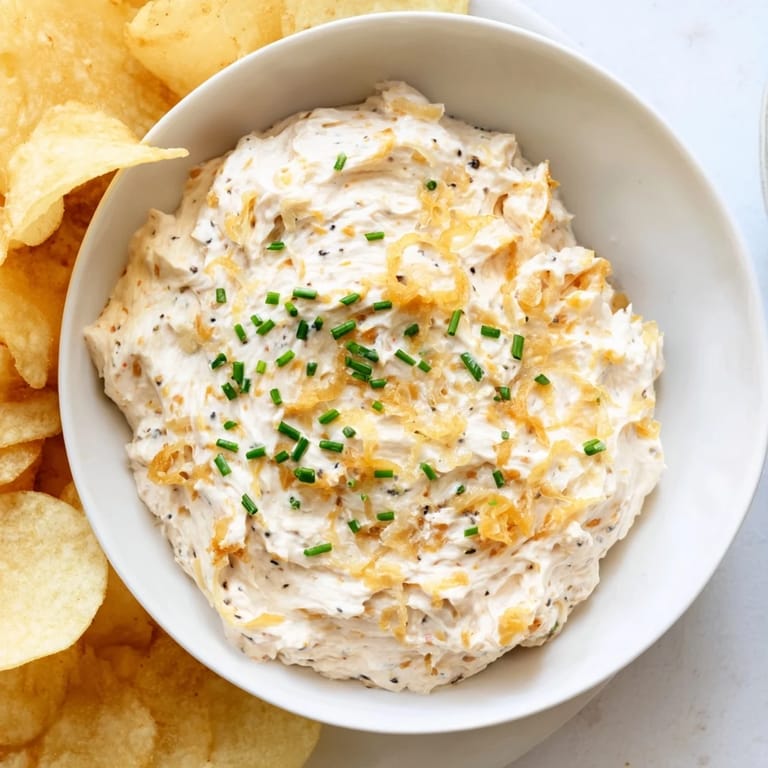 Save A crowd-pleasing snack featuring crisp salty potato chips paired with a creamy tangy onion dip—perfect for parties game nights or casual gatherings.
