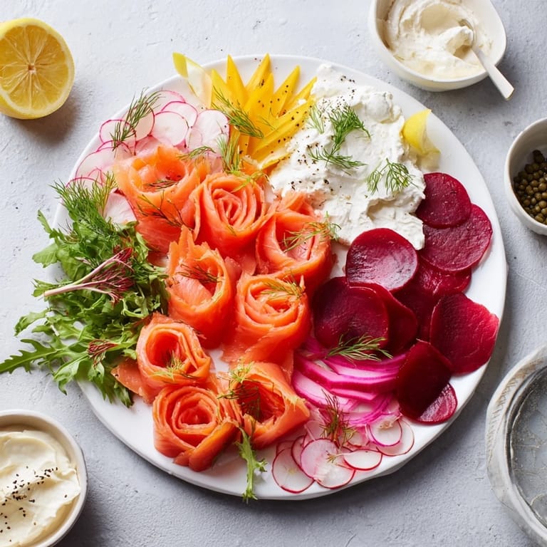 This winter harvest board combines delicate smoked salmon with roasted beets, fennel, radishes, and baby arugula for a colorful presentation. Tangy spreads like cream cheese, herbed goat cheese, crème fraîche, and horseradish sauce add creamy layers. Rustic baguette slices, rye crackers, and pumpernickel bread provide hearty textures, topped with garnishes of lemon wedges, capers, and fresh dill. Ideal for entertaining, this easy-to-assemble board invites guests to build their own bites and savor seasonal flavors.